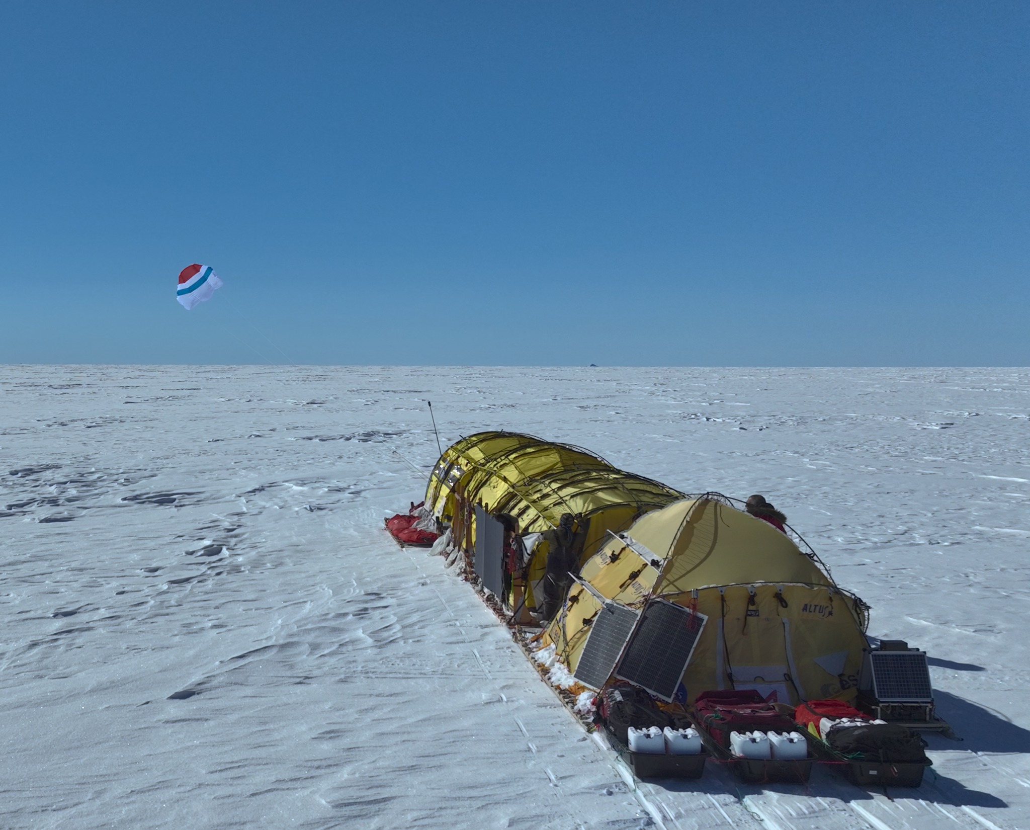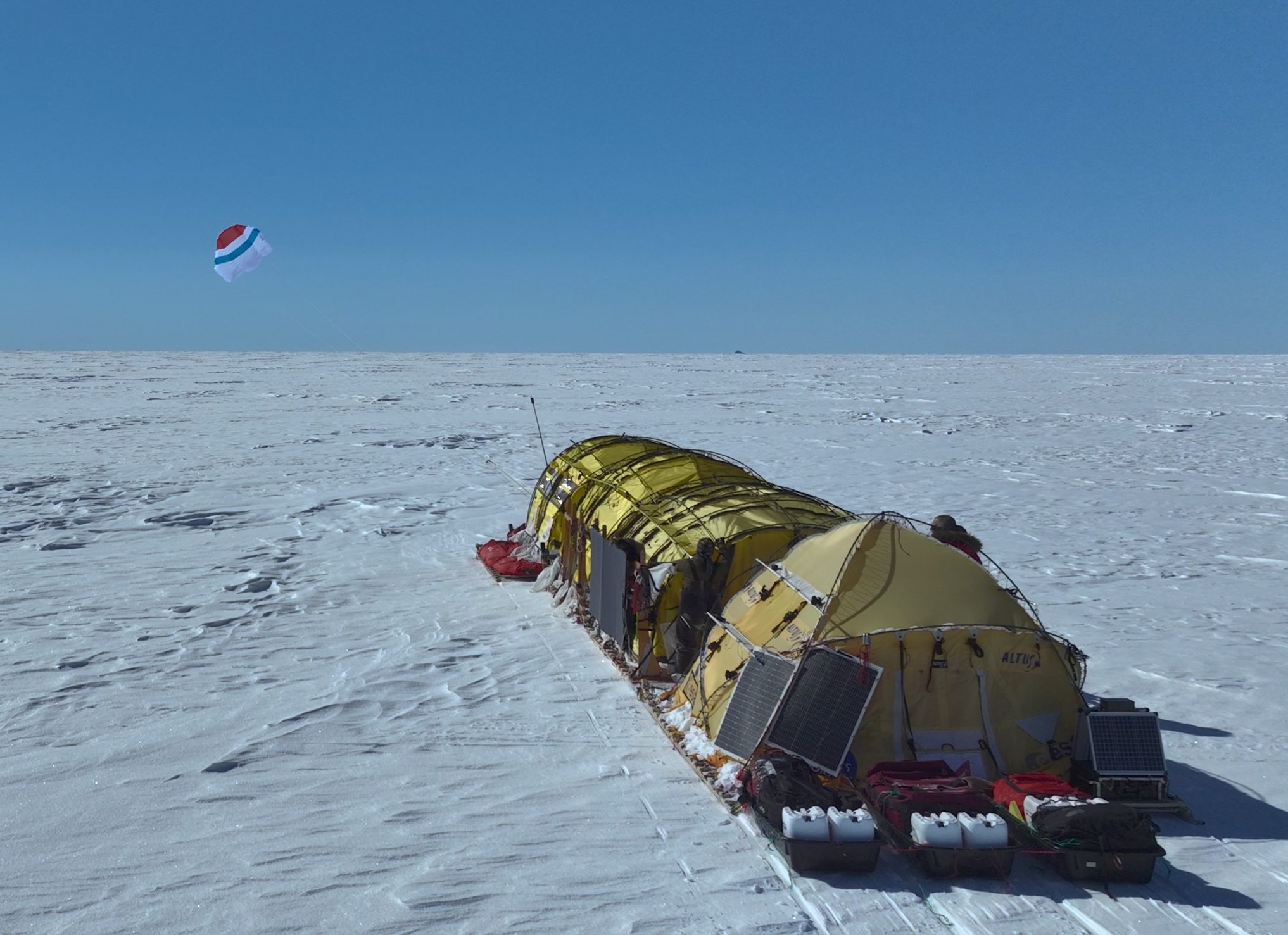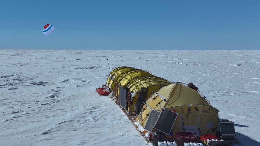 El viento ha sido muy débil durante el día, por lo que decidimos concentrar nuestras energías durante la noche. Cuando el sol se escondía en el horizonte y, con él, las temperaturas (¡esta mañana hemos alcanzado los -38 grados!), haciendo que la ventana horaria entre las 23.00 y las 7.00 horas sea la mejor hora para la navegación. Ayer, alrededor de las cuatro, a pesar del frío, nuestra atención se centró en el increíble paisaje que teníamos ante nosotros: a nuestra izquierda la luna llena tiñéndose de tonos rosados se elevaba en lo alto del cielo, mientras que, un poco más lejos, a la derecha, la luz de la mañana se elevaba tímidamente pero con fuerza en el horizonte. Exactamente en el medio, sobre el mar de hielo, volaba nuestra cometa. A partir de esta noche y durante las próximas 20 horas tendremos vientos favorables. Tenemos por delante una larga jornada para intentar recuperar los kilómetros perdidos en los últimos días.