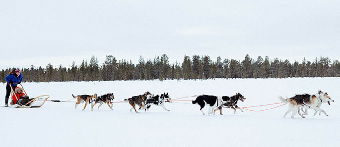 Tras la recogida y equipamiento con la ropa térmica que nos prestarán (mono térmico, botas de nieve, calcetines y manoplas), nos dirigiremos a una granja típica finlandesa de perros huskies. El guía nos explicará la técnica de conducción de los trineos así como nos detallará las instrucciones de seguridad. Los trineos son dobles: un aventurer@ estará conduciendo el trineo mientras que otr@ estará sentado en el trineo. A mitad del recorrido, se hará el cambio de conducción del trineo.